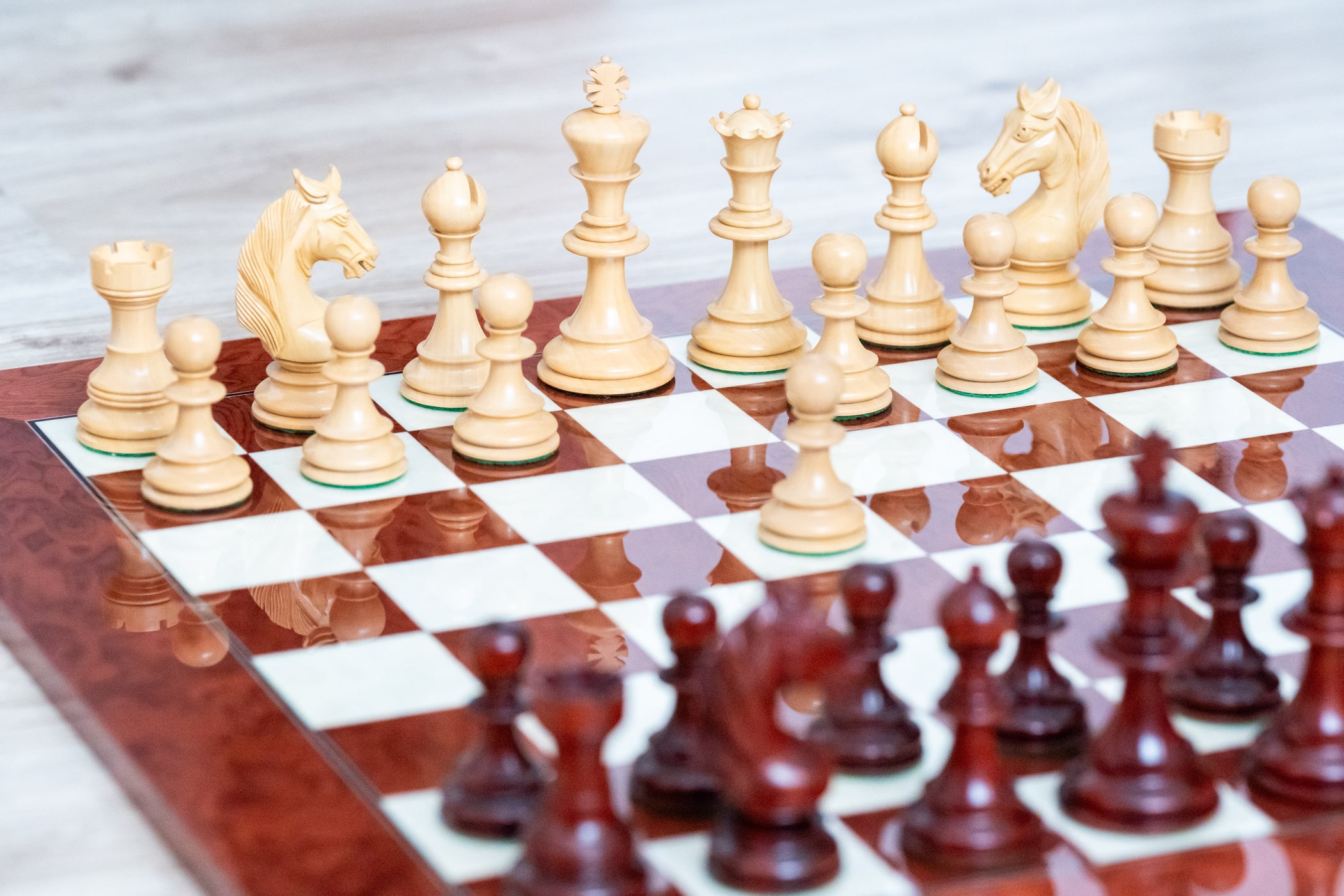 Wenn Ihre Hände die lackierte Oberfläche berühren, werden Sie die Tiefe und Intensität von Scharlachrot spüren - der Farbe von Kaisern, Kriegern und Visionären. Dieses Schachbrett ist nicht nur ein Spielfeld. Es ist eine Bühne, auf der epische Schlachten des Geistes ausgetragen werden, auf der jeder Zug mehr bedeutet als nur die Bewegung einer Figur. Er ist ein Schritt in Richtung Sieg, ein Spiegelbild deines Könnens, ein Prüfstein deiner Entschlossenheit.