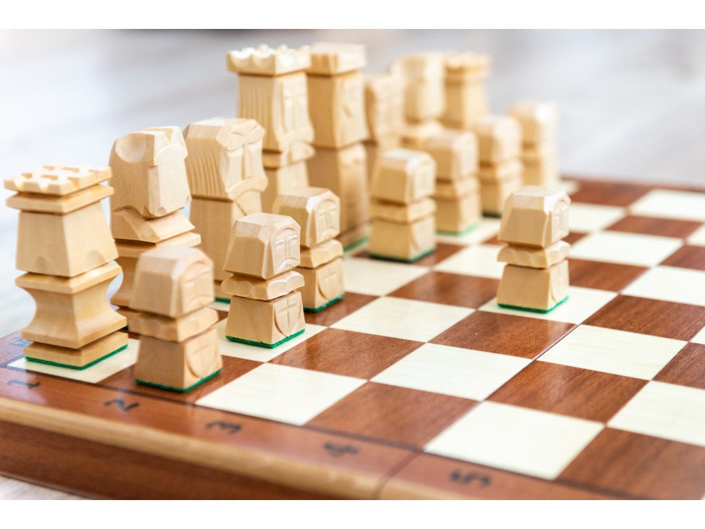 Das Schachset Krakonoš ist ein einzigartiges, handgefertigtes Schachspiel aus verschiedenen Holzarten und klappbarem Schachbrett.
