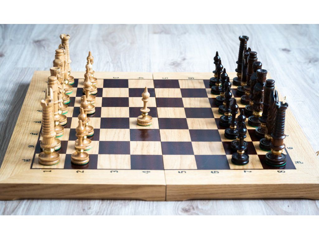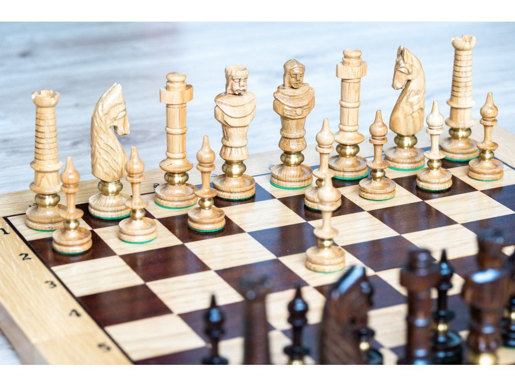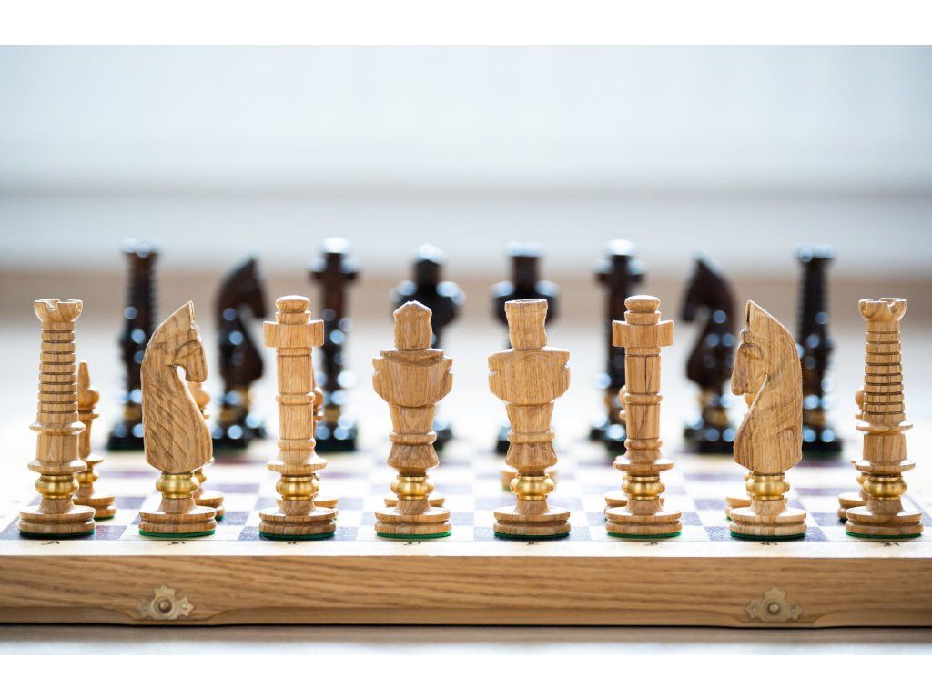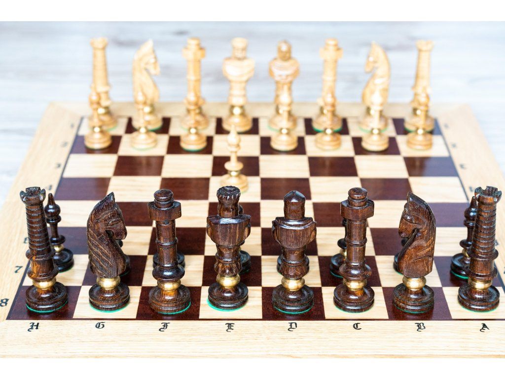 Grand Oak Chess Set with Brass-Weighted Pieces