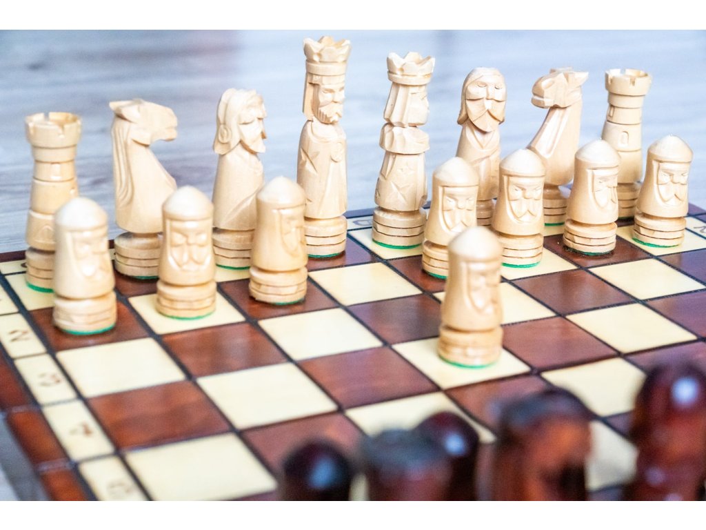 Schachspiel aus Holz mit interessantem Aussehen, geeignet als Geschenk, aber auch zum Spielen für zu Hause, in einem Cafe oder bei gesellschaftlichen Veranstaltungen. Die Größe des Schachspiels ist eine der größten und wird zu einem unübersehbaren Teil jedes Raums, in dem es aufgestellt wird.