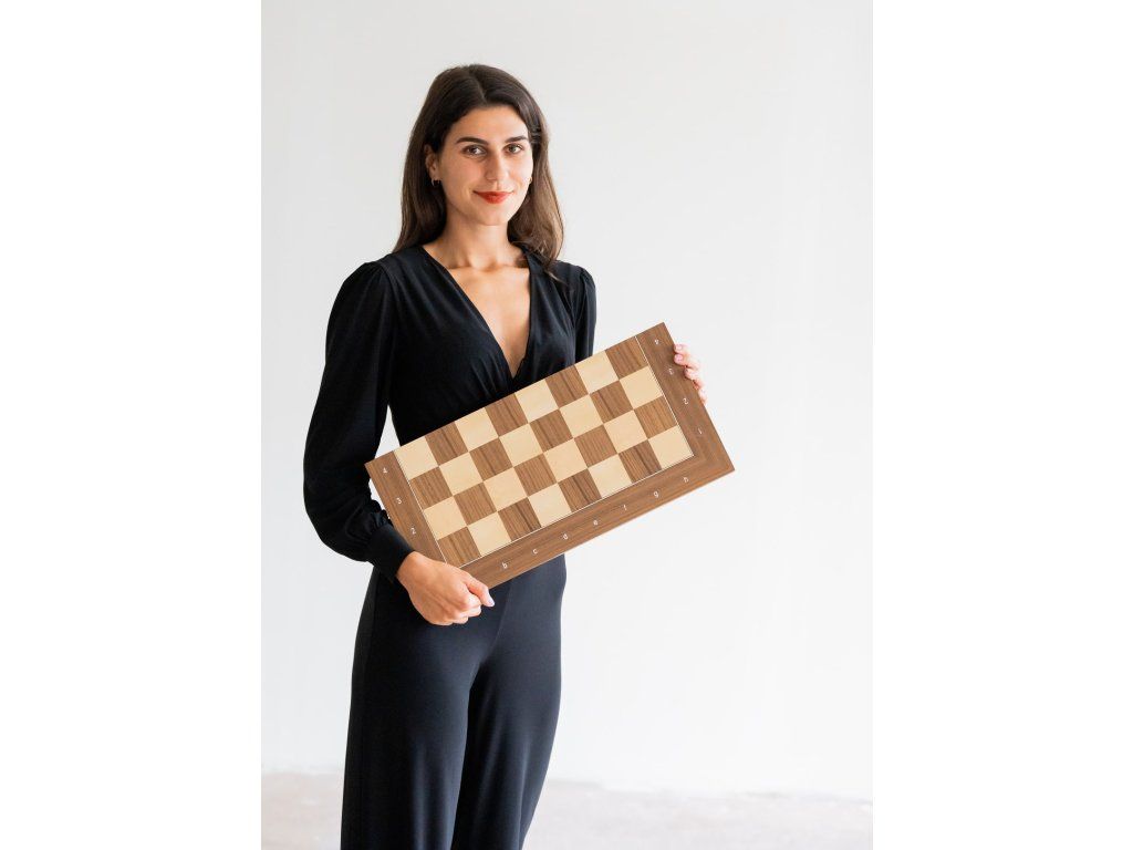 Klappbares Schachbrett aus Holz, mit Filzunterlage, um Abrieb zu verhindern. Das Klappgelenk ist sehr stark und durch eingebaute Metallscharniere gesichert.