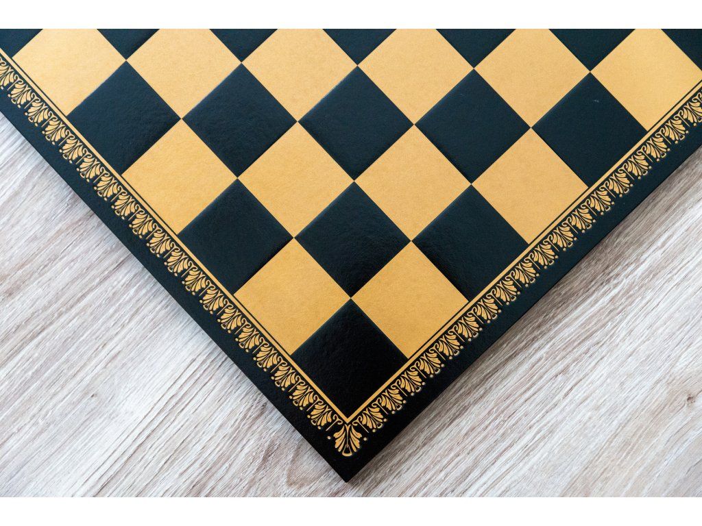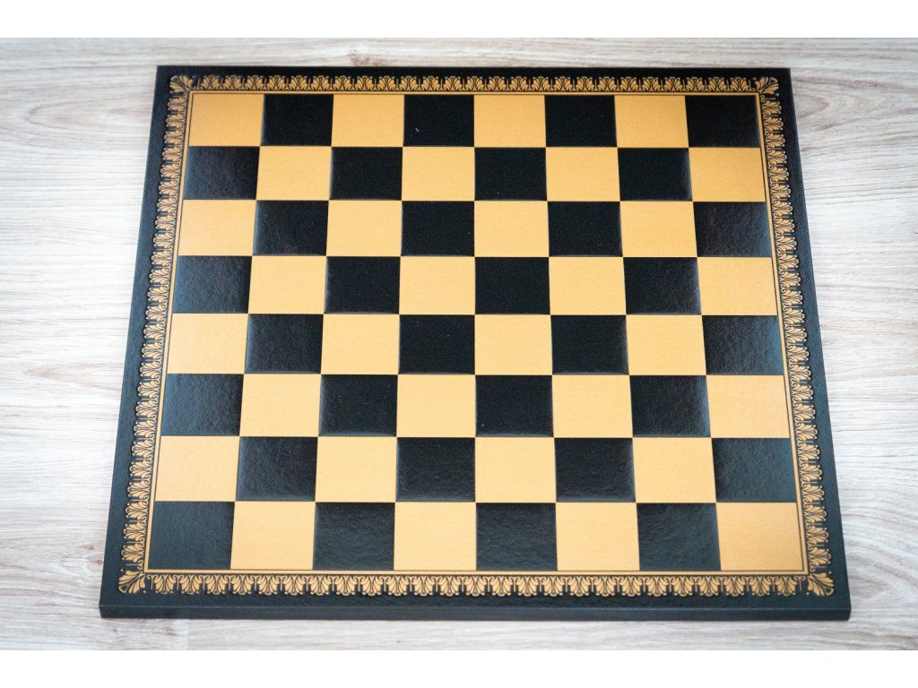 Ungewöhnliches Schachbrett, handgefertigt aus Holz und mit Kunstleder überzogen und mit goldenen Ornamenten an den Rändern verziert.