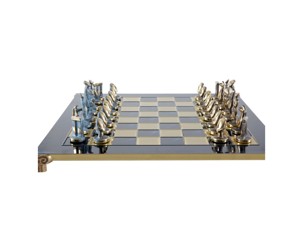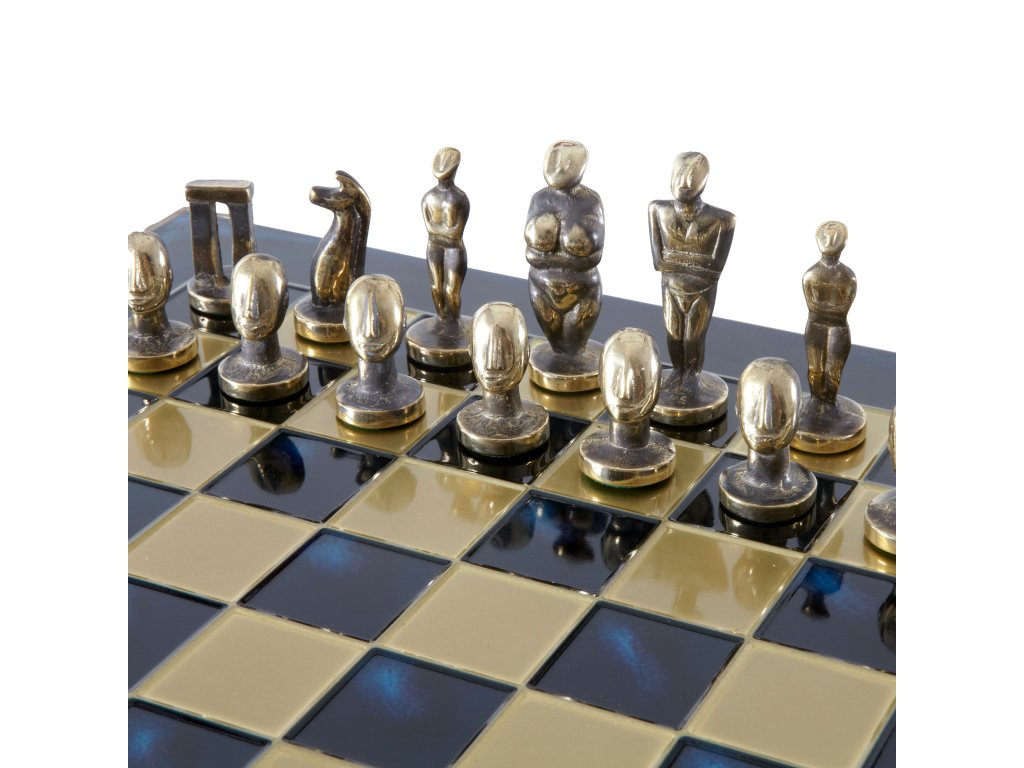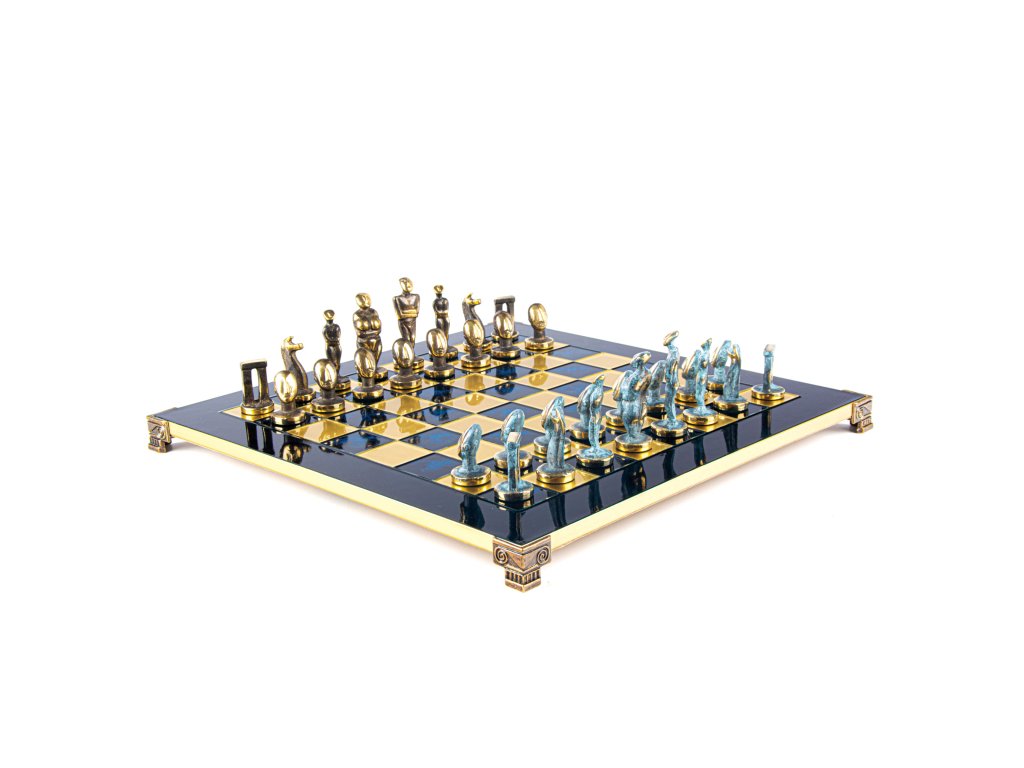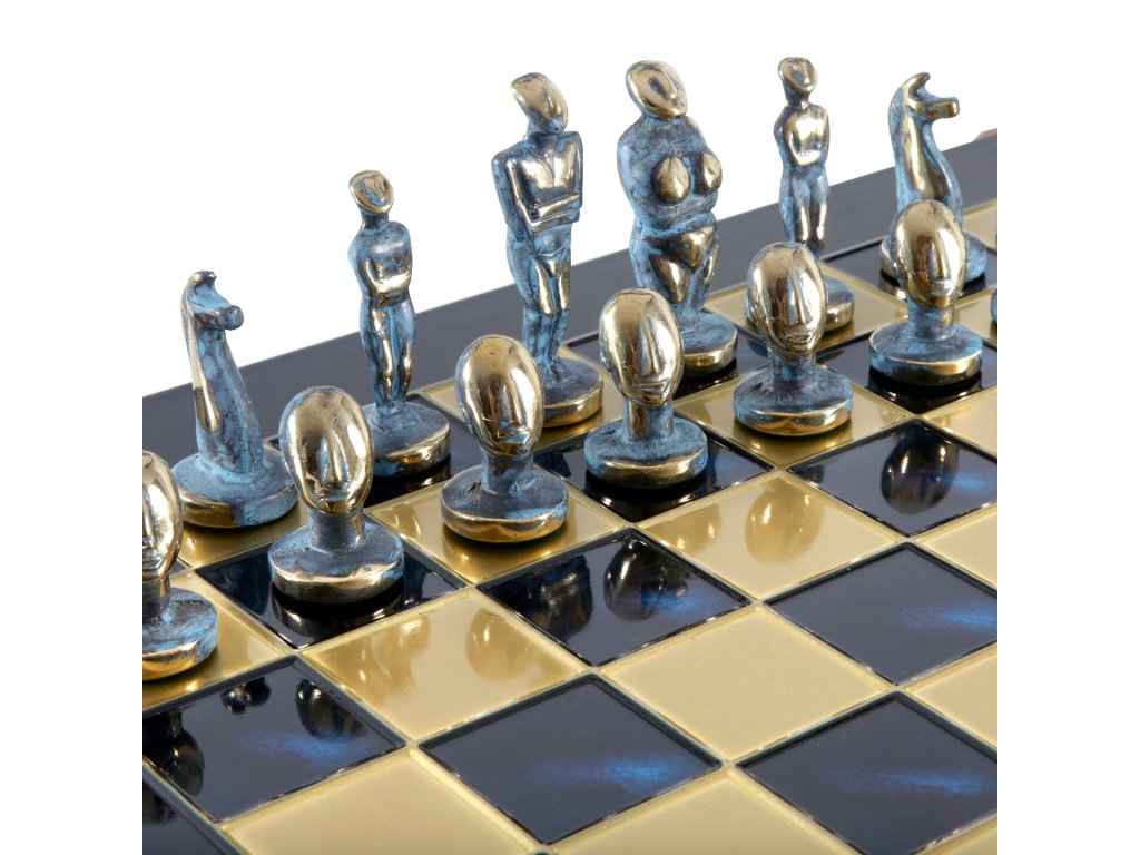 Jedes Stück, sorgfältig aus massivem Messing gefertigt und in atemberaubenden Blau- und Brauntönen gehalten, fängt die ruhige Eleganz der kykladischen Statuen ein. Dieses große, luxuriöse Set ist ein wahres Meisterwerk, perfekt zum Spielen und Ausstellen in jedem anspruchsvollen Spielraum.