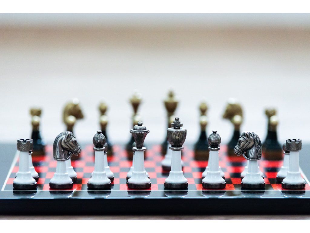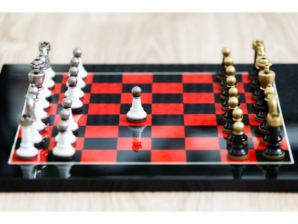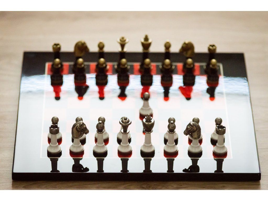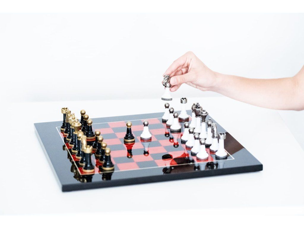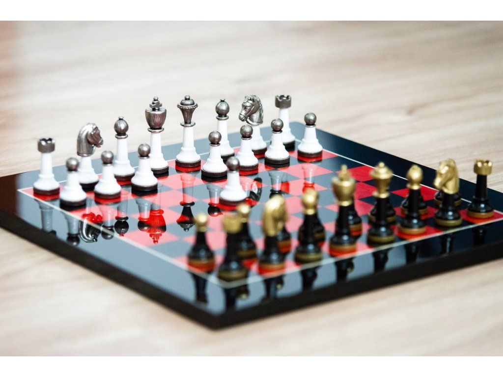 Schachfiguren aus Metall und lackiertem Holz mit Handarbeit. Die Schachfiguren sind ein geeignetes Geschenk zum Beispiel für Geburtstage, Schachkenner oder zu Repräsentationszwecken.