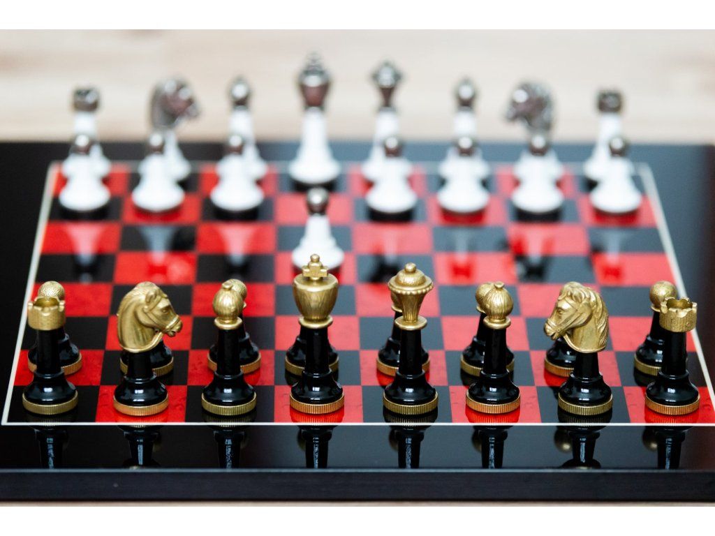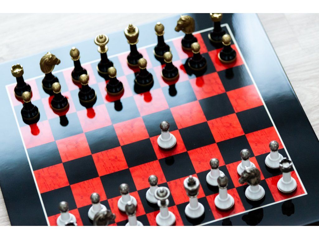 Schachbrett aus Bruyereholz mit Hochglanz dank einer Präzisionslackierung. Die Schachfiguren, die mit einer ungewöhnlichen Kombination von Holz und Metall geschaffen wurden, bieten ein außergewöhnliches Schachspielerlebnis.