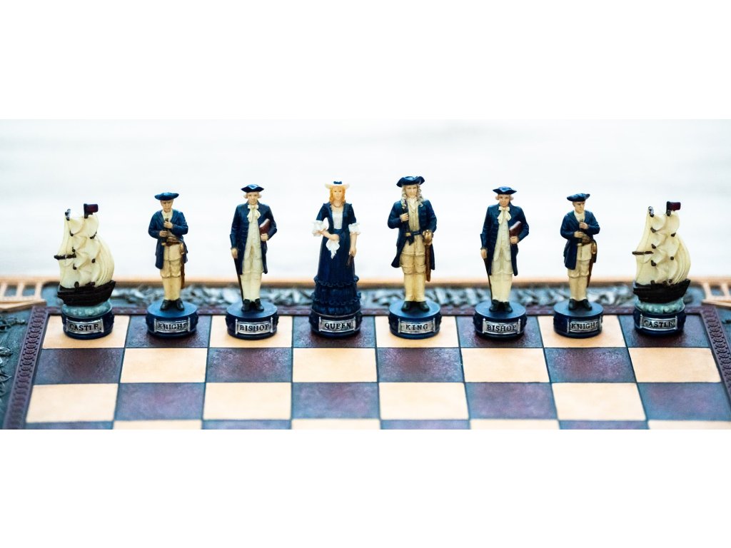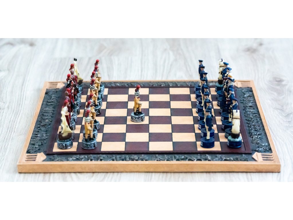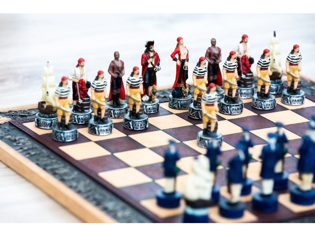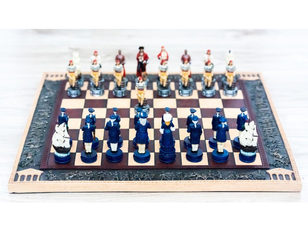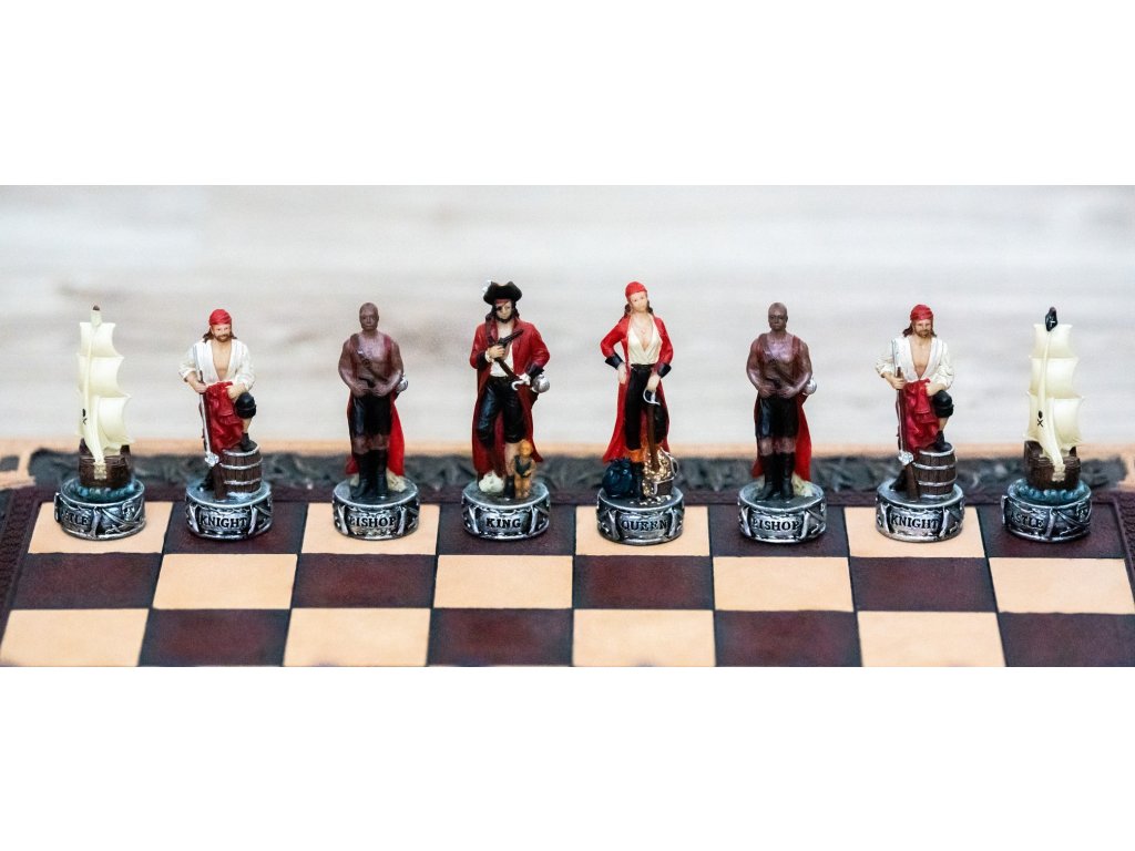 Handgefertigte Schachfiguren aus gehärtetem Harz mit der Darstellung von Matrosen und Piraten. Dieses Set wird jeden Liebhaber von Seeschlachten begeistern.