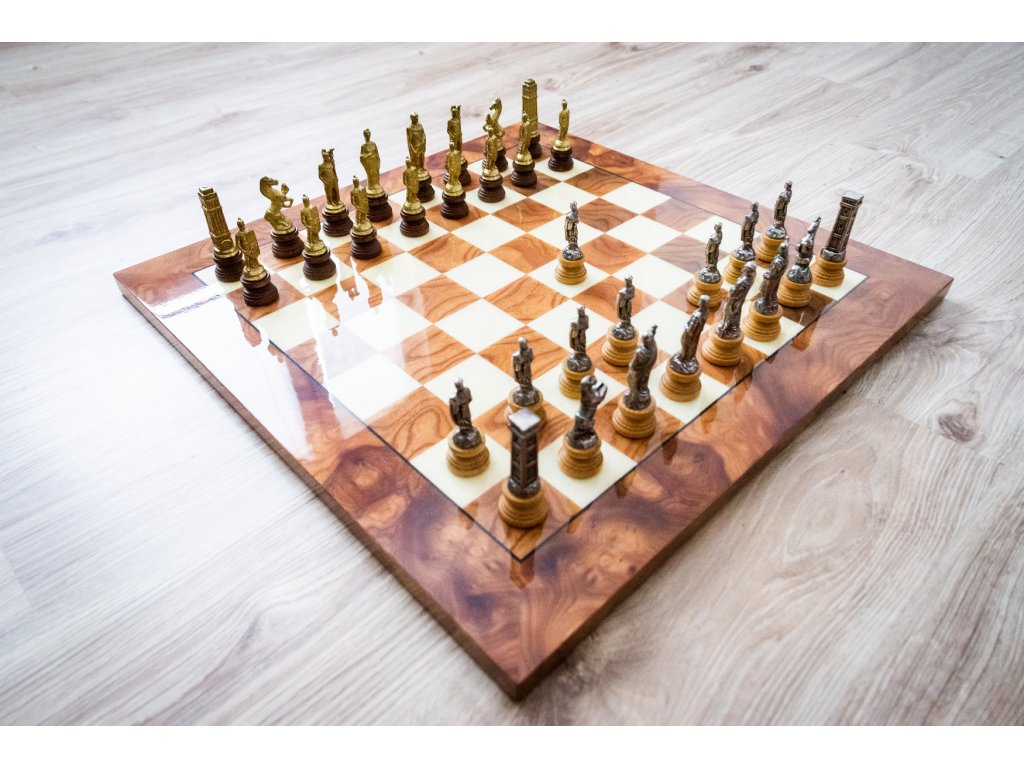 Dieses elegante Schachspiel stellt die Reihen einer römischen Legion dar, die einer der vielen barbarischen Streitkräfte gegenübersteht, die sie während der jahrhundertelangen römischen Feldzüge in ganz Europa bekämpften.
