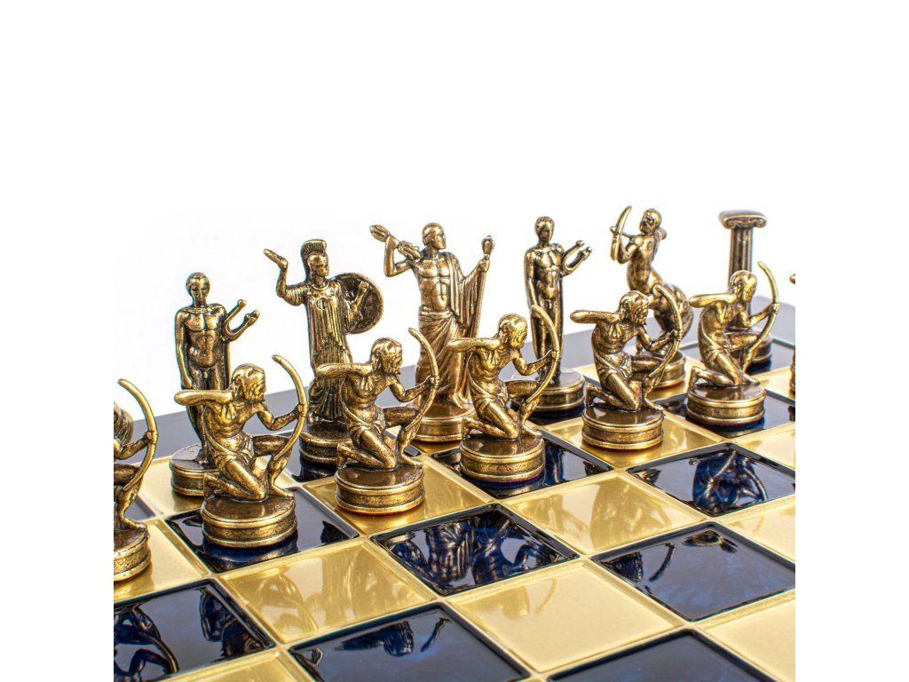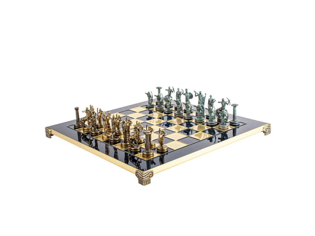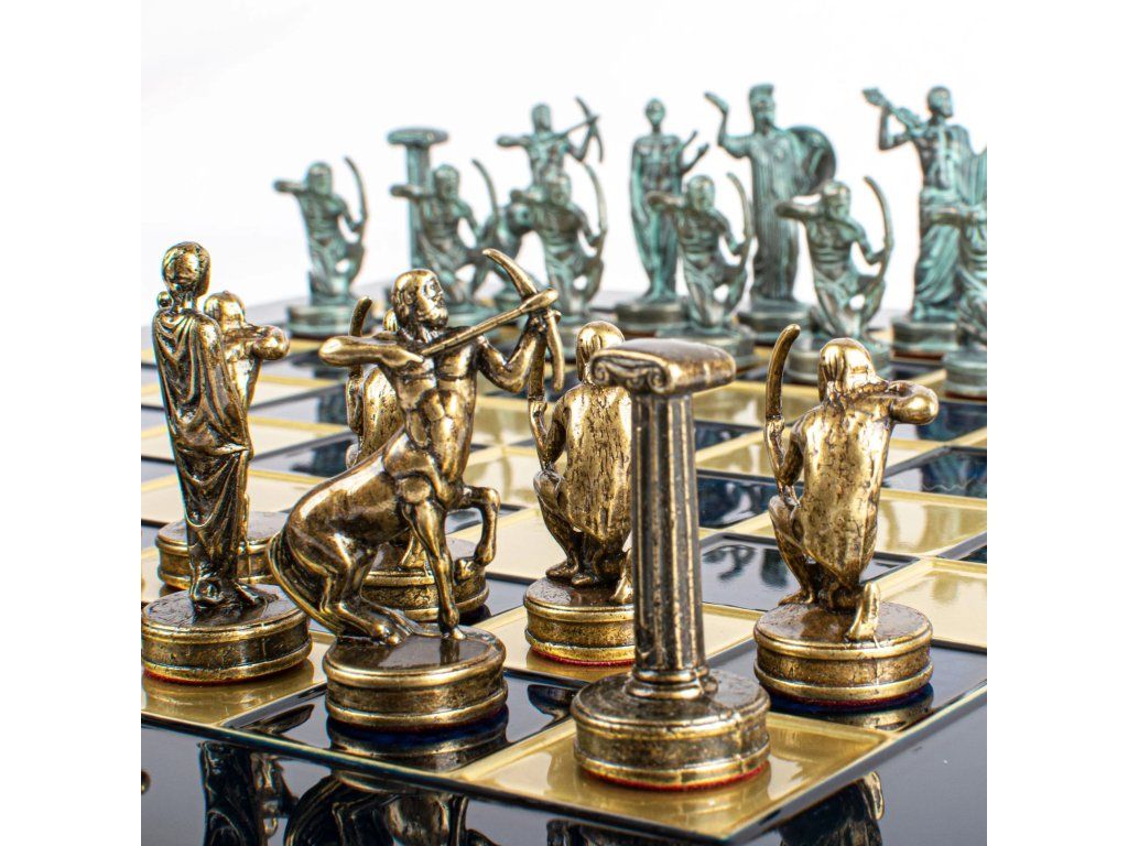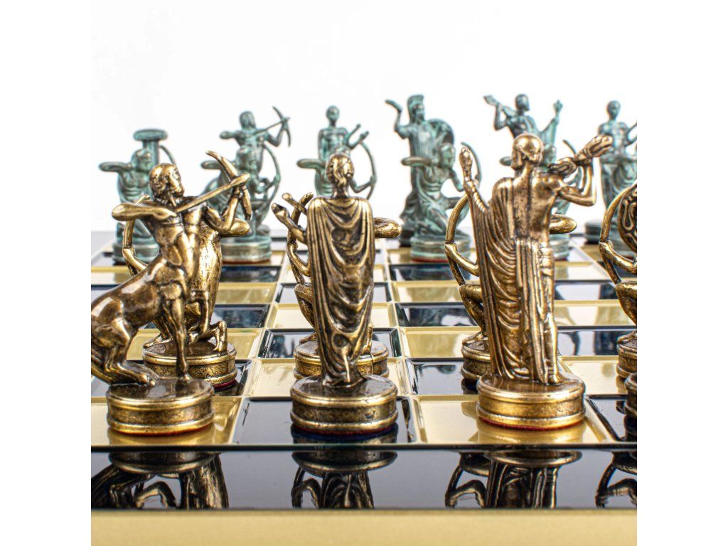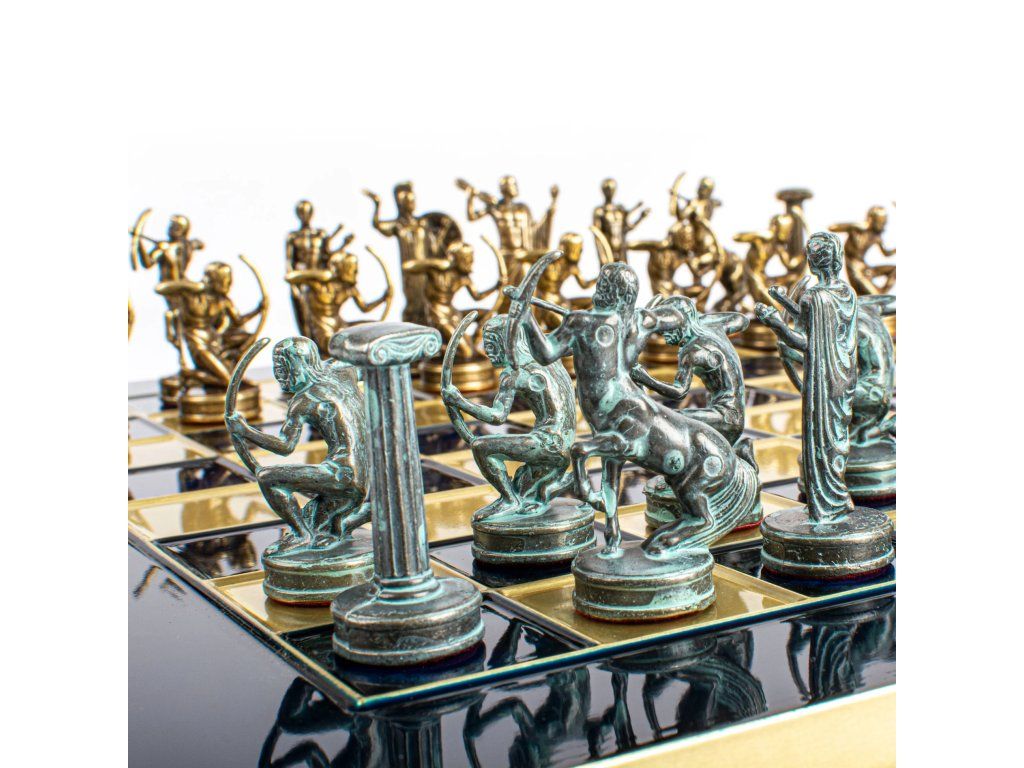 Betreten Sie die Welt der antiken griechischen Mythologie mit dem handgefertigten Schachset Hercules. Dieses mittelgroße Set enthält goldene und silberne Schachfiguren auf einem bronzenen Schachbrett von 36 x 36 cm und feiert die legendären Geschichten und heldenhaften Taten des Herkules.