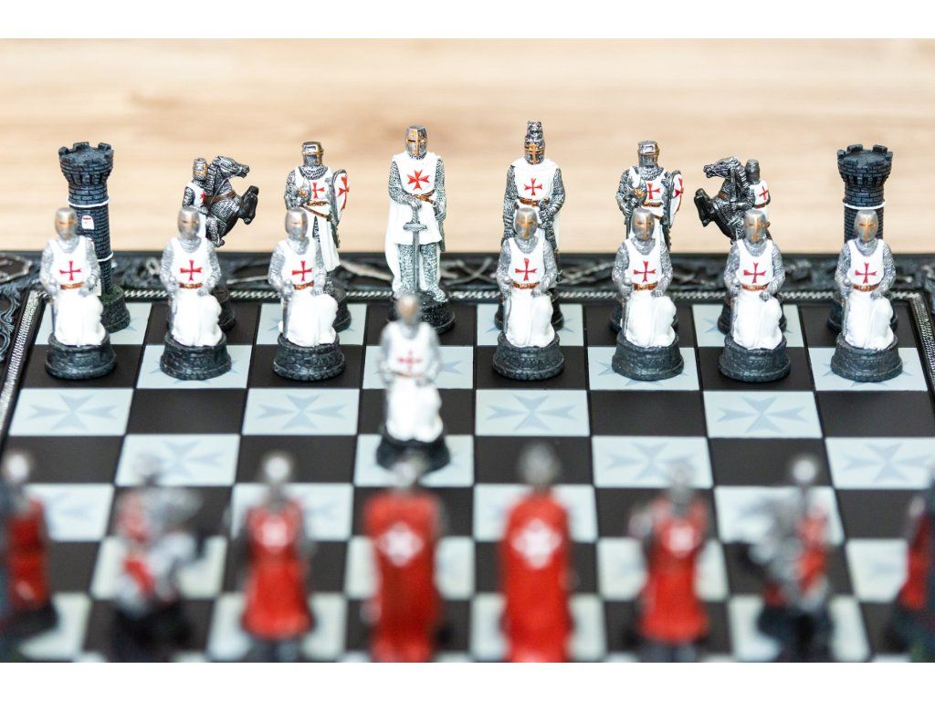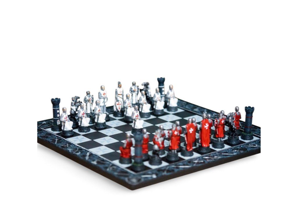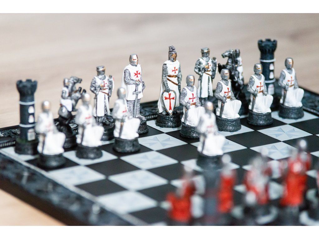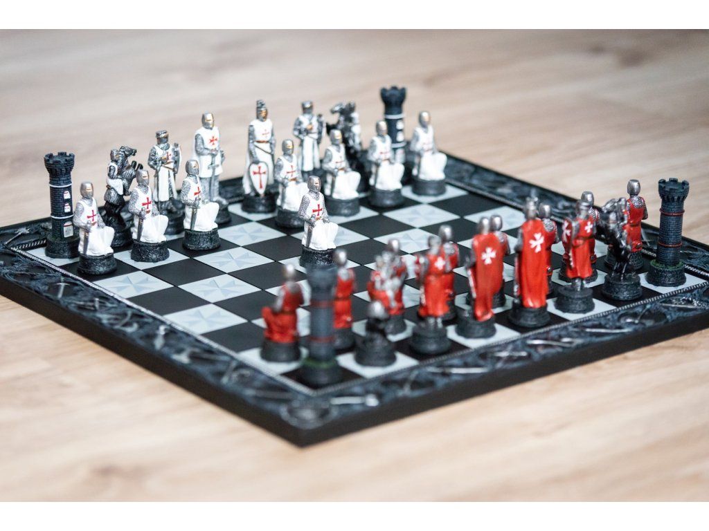 Handbemalte Schachfiguren mit dem Motiv der Kreuzritter bringen einen Hauch von Geschichte in Ihr Schachspiel. Schachbrett mit Kreuzzugsmotiv und Sockel aus Harz.