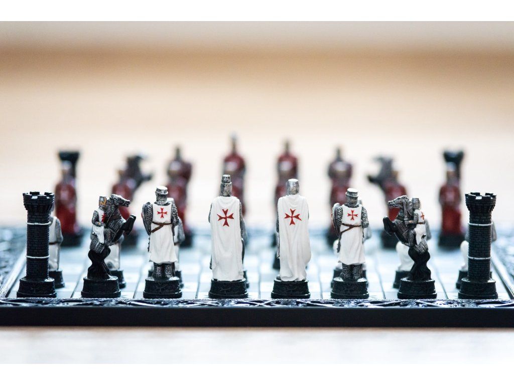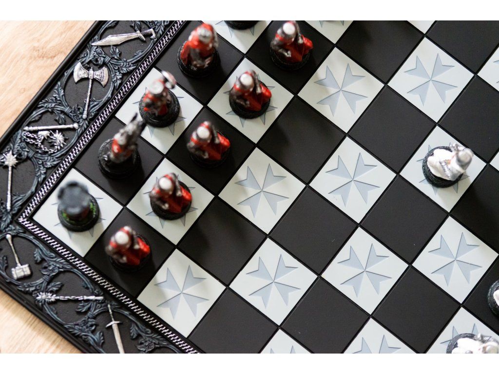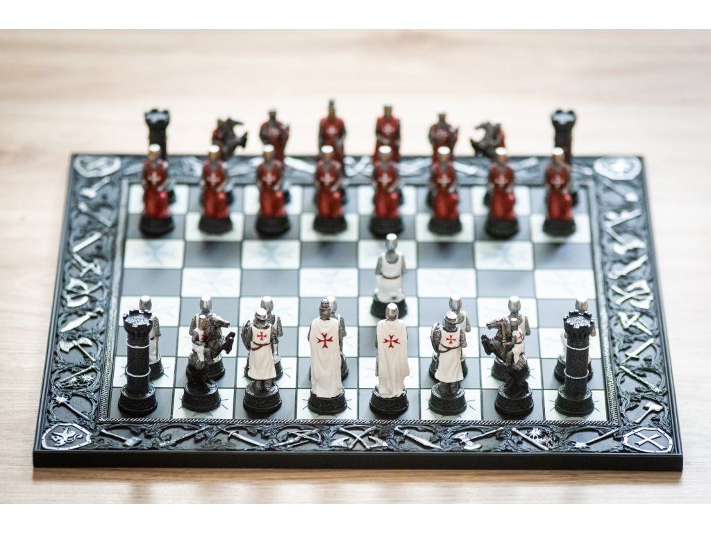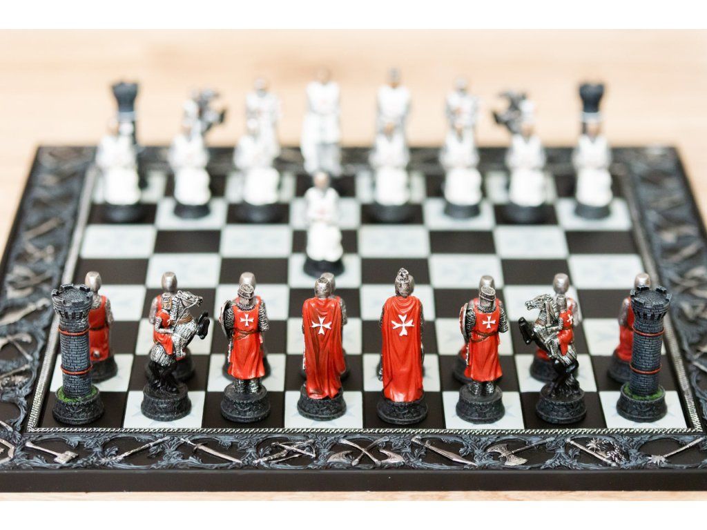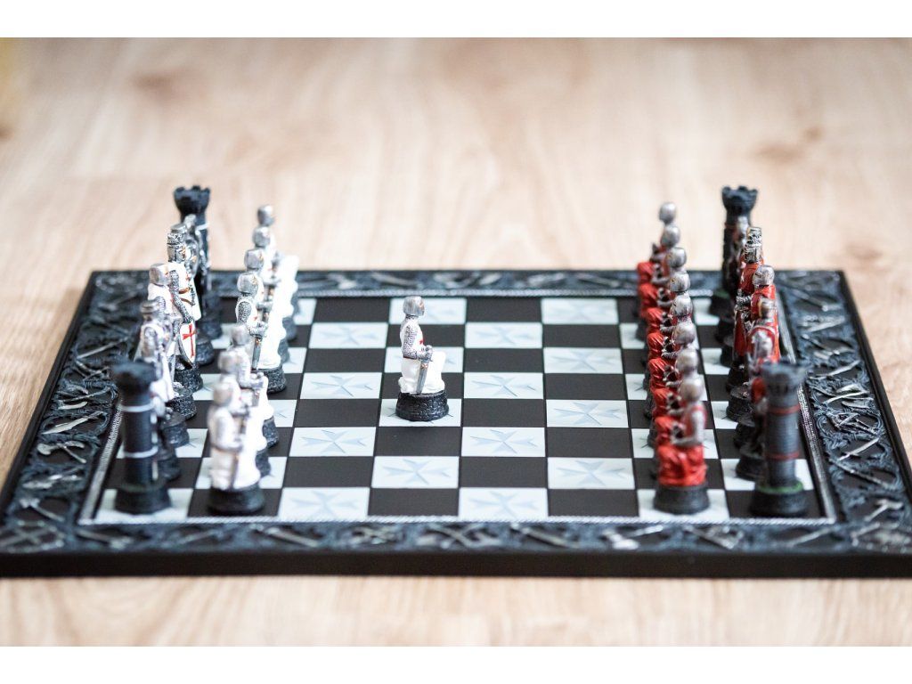Handbemalte Schachfiguren mit dem Motiv der Kreuzritter bringen einen Hauch von Geschichte in Ihr Schachspiel. Schachbrett mit Kreuzzugsmotiv und Sockel aus Harz.