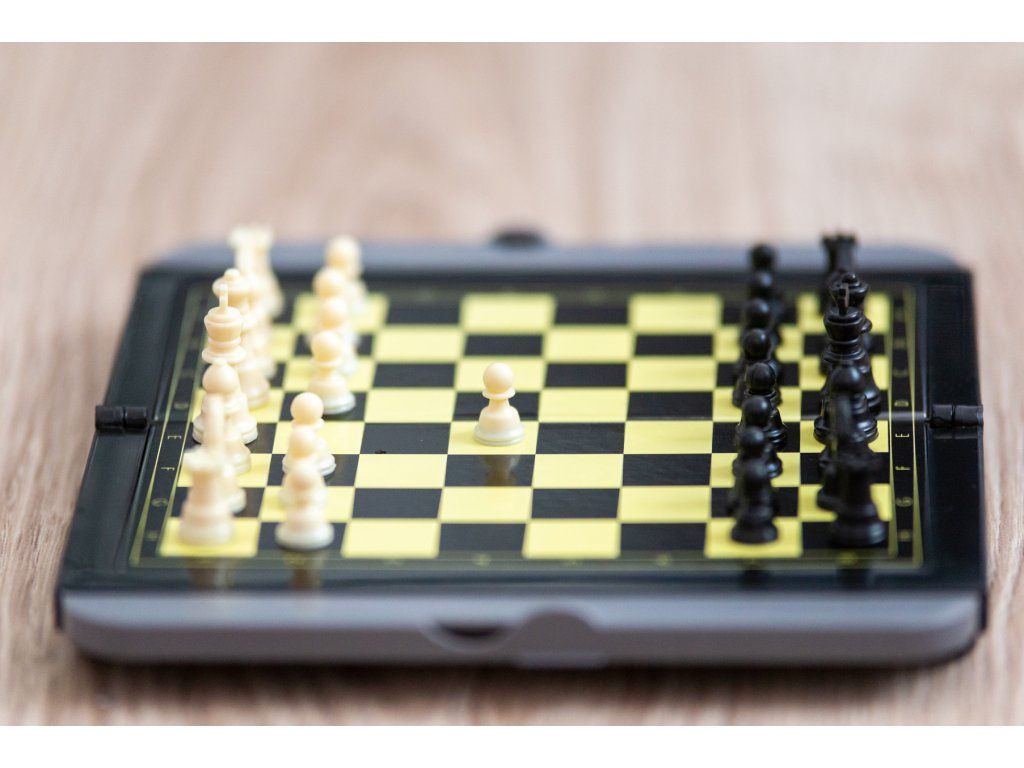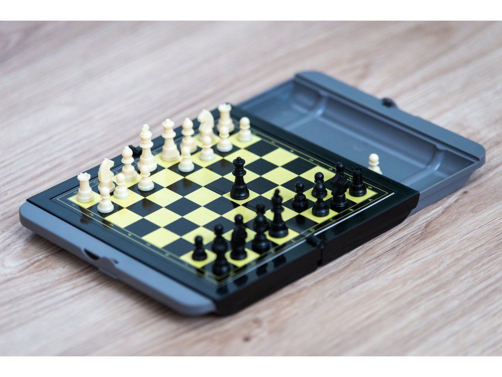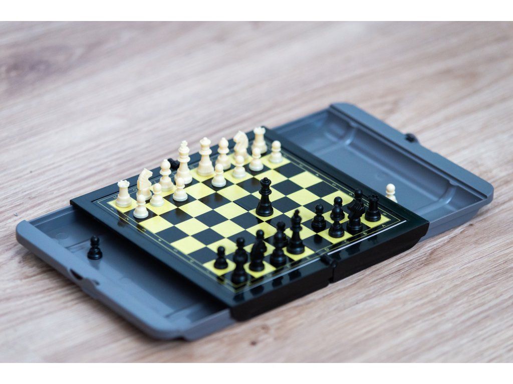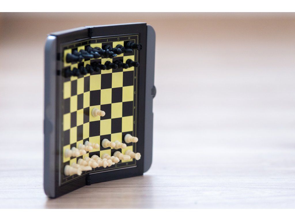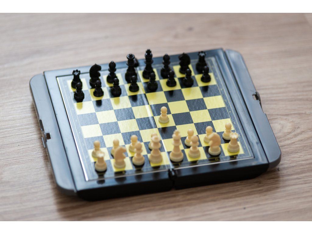 Magnetisches Schachspiel, das aufgrund seiner Größe praktisch für Reisen ist. Zusammengeklappt ist es so groß wie ein Brillenetui. Ein starker Magnet in den Figuren sorgt dafür, dass sie fest mit dem Schachbrett verbunden sind.