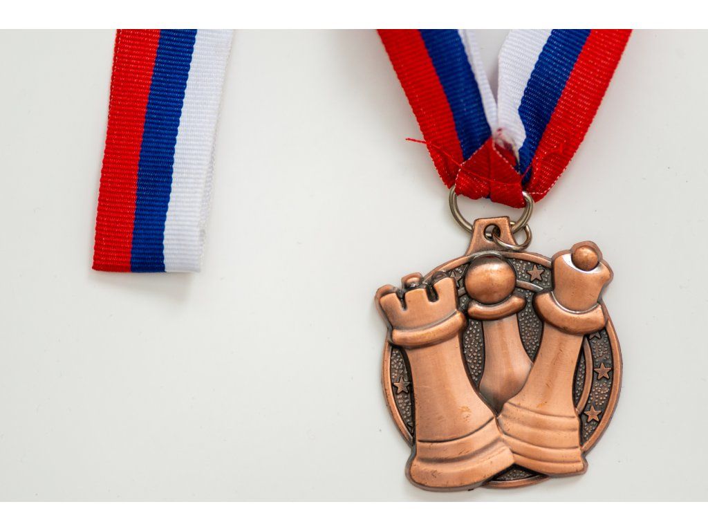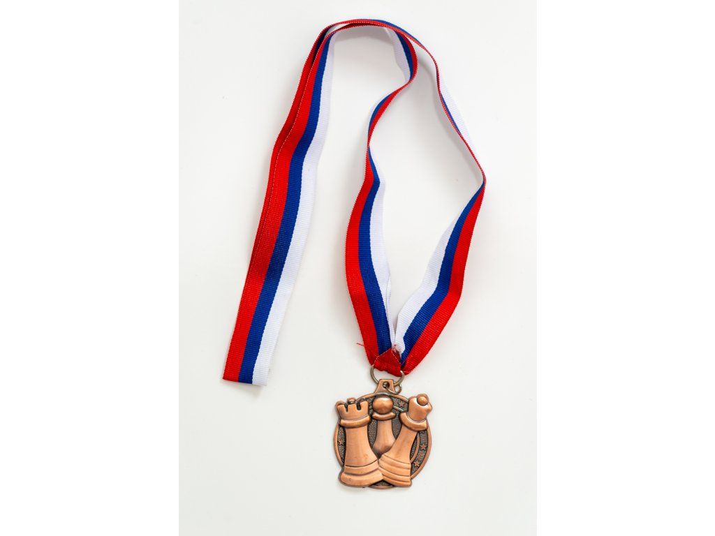 Bronzemedaille für Gewinner von Schachwettbewerben. Die Medaille ist schon komplett mit einem Band. Auf der Rückseite können Informationen über die Veranstaltung geklebt werden.
