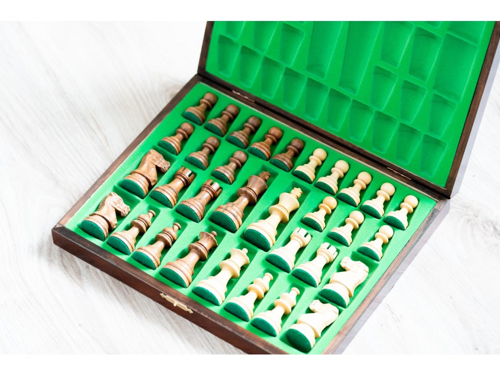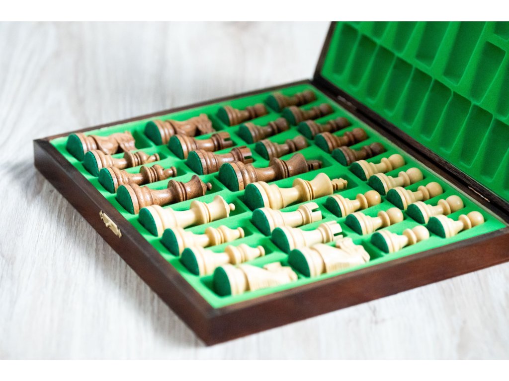 Eine beliebte Version der Staunton-Figuren in luxuriösem Akazienholzverarbeitung, ausbalanciert mit einer weichen Basis.