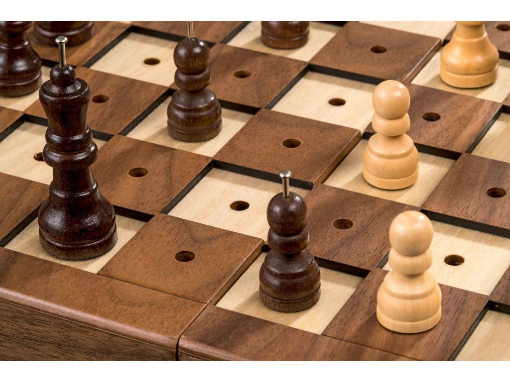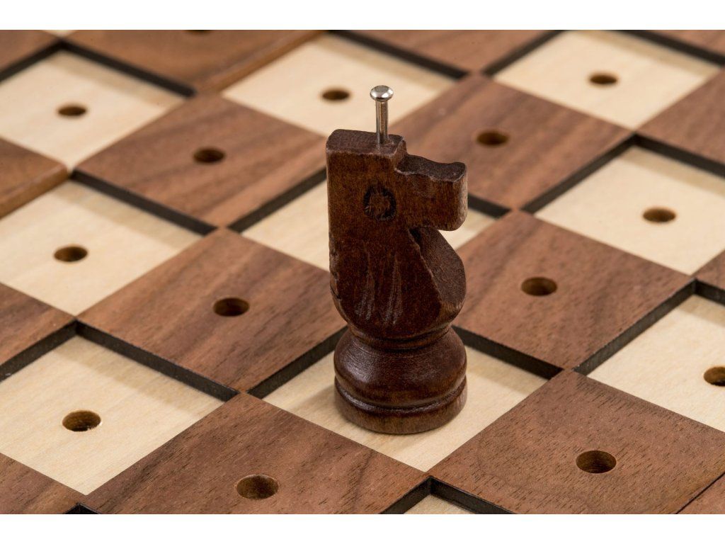 Das Schachbrett enthält Löcher in den Feldern, in die die Figuren eingesetzt werden, um ein Verschieben zu verhindern. Die weißen und schwarzen Felder haben unterschiedliche Höhen, so dass man durch Ertasten feststellen kann, welche Farbe das Feld hat.