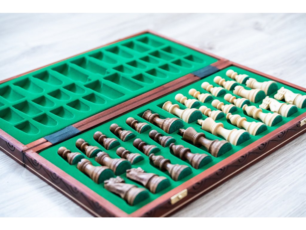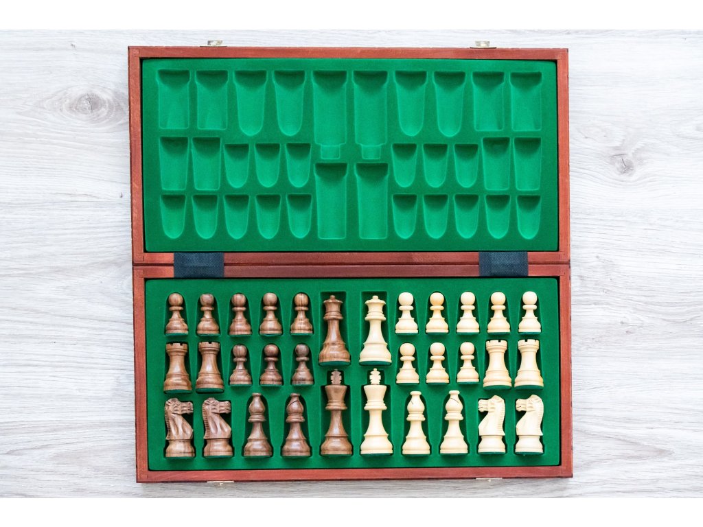 Professionelle Holzschachfiguren aus Akazienholz in einem praktischen Abschlussschachbrett. Mit diesem Schachset haben Sie Ihr Lieblingsspiel in hervorragender Verarbeitung immer zur Hand.