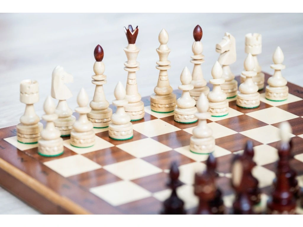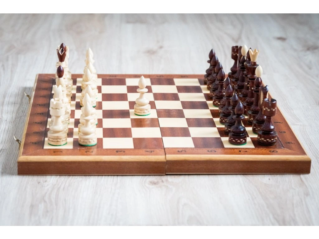 Holzschach mit interessantem Aussehen, geeignet als Geschenk, aber auch zum Spielen zu Hause, in einem Café oder bei gesellschaftlichen Veranstaltungen.