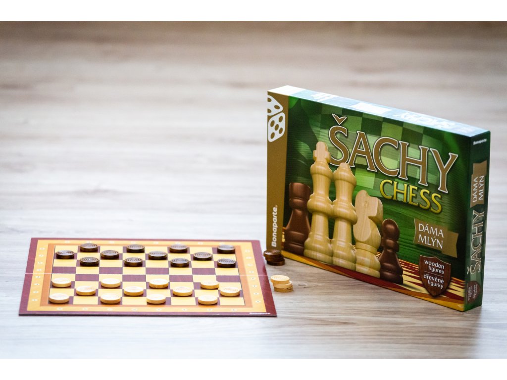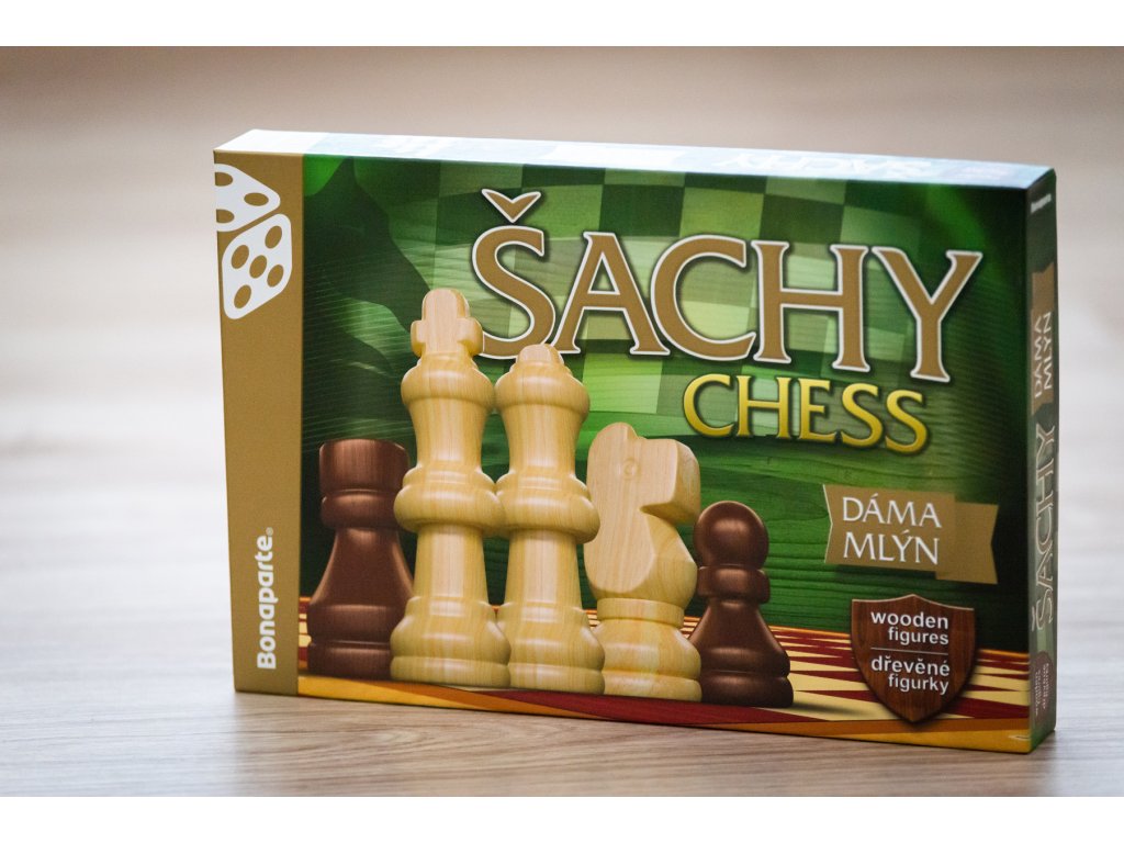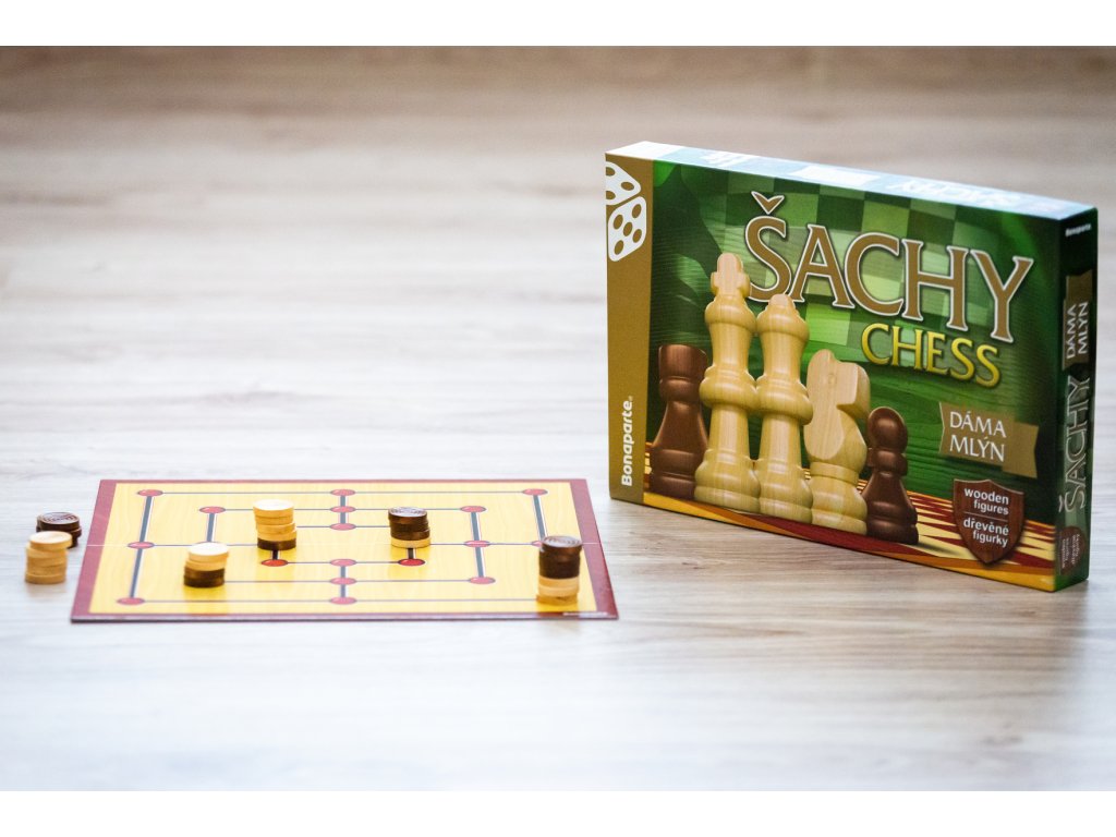 Das Set enthält Schachbrett, 32 Schachfiguren, 24 Steine für Dame und Mühle und eine Anleitung.
