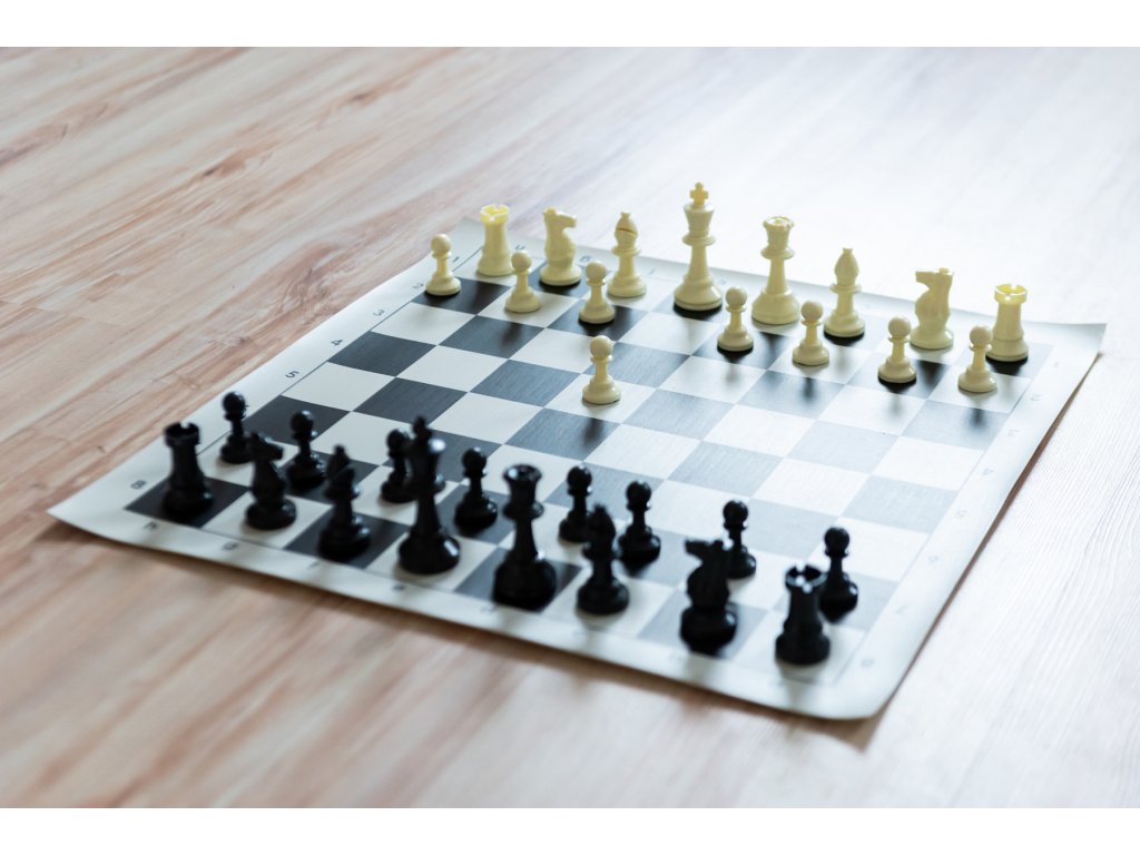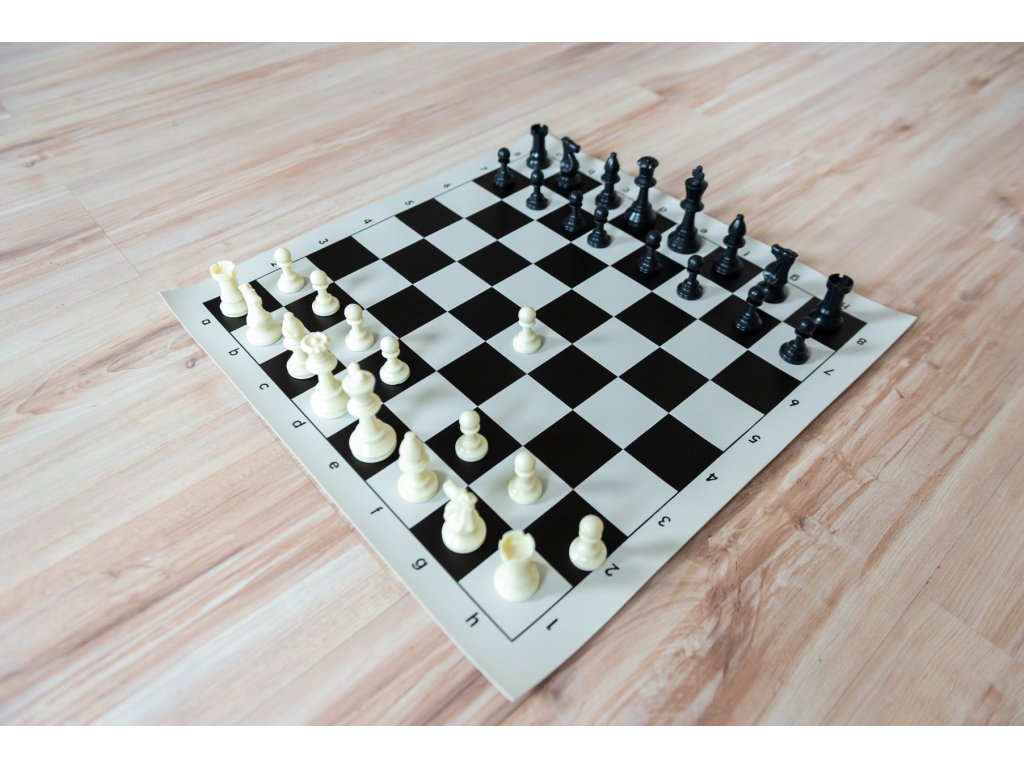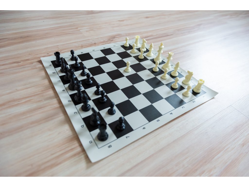 Rollbares Schachbrett schwarz, Schachfiguren mittelgroß