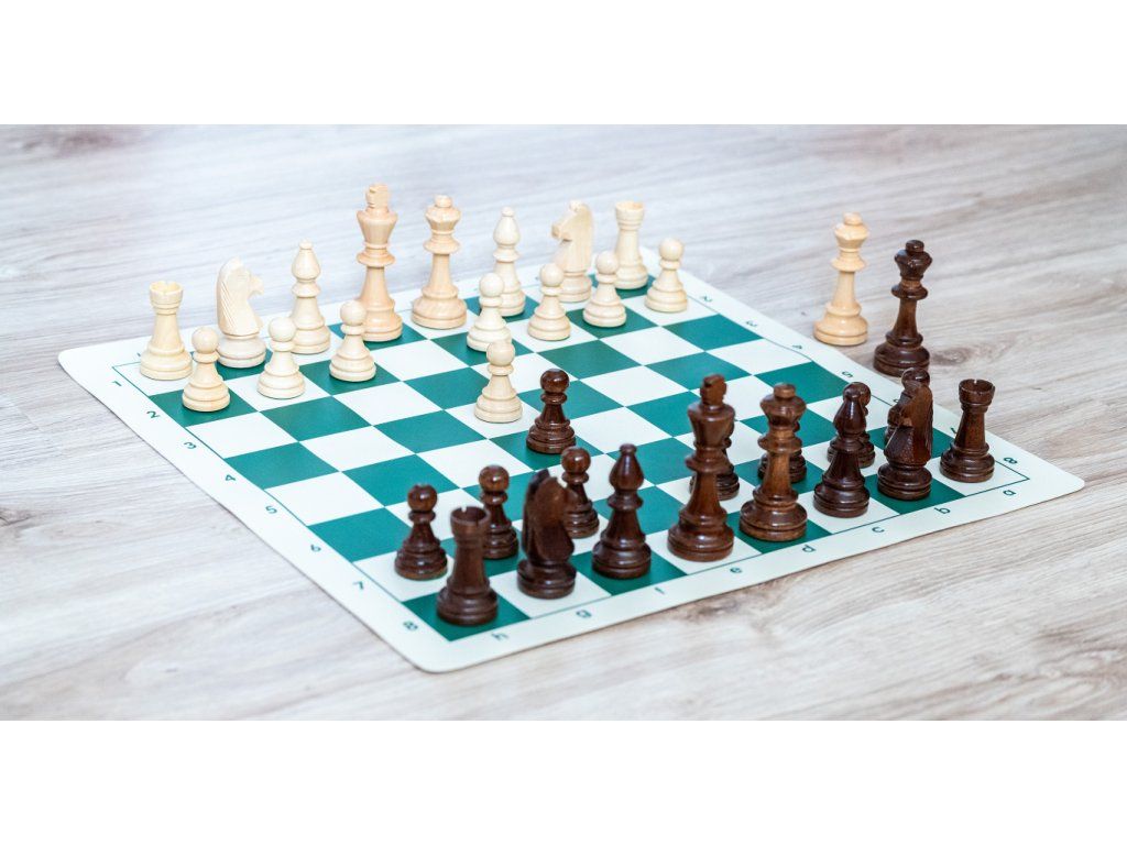 Rollbares grünes Schachbrett, Schachfiguren, Stoffbeutel für die Figuren