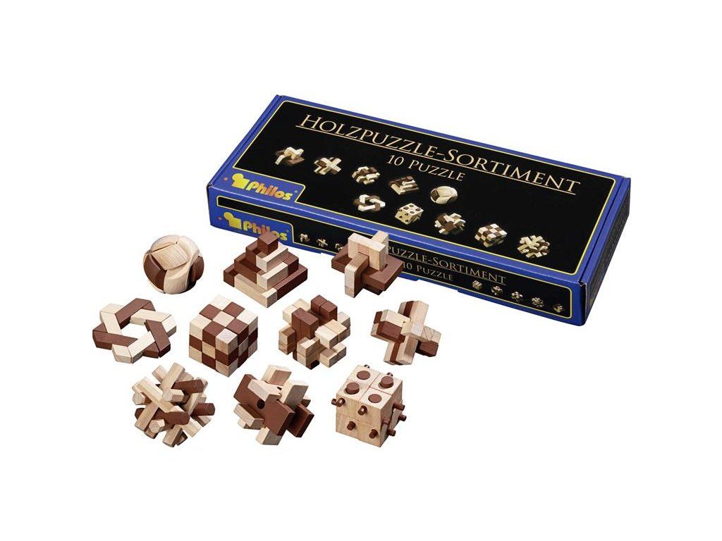 Zehn Holzpuzzles in verschiedenen Schwierigkeitsstufen, die das kreative und abstrakte Denken fördern. Das Ziel ist, sie auseinander zu nehmen und wieder zusammenzusetzen.